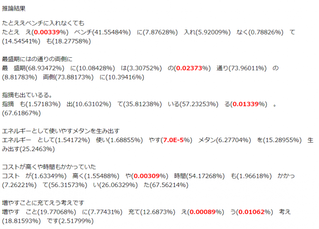正しい(あるいは誤りが少ないと思われる)文章を学習させ、「次に現れる単語」の確率を計算させます。この確率がしきい値以下であれば、「間違いじゃね?」という反応をするというわけです。以下のように結果を出力します。ある商用Webメディアに実際に掲載されていた文です。