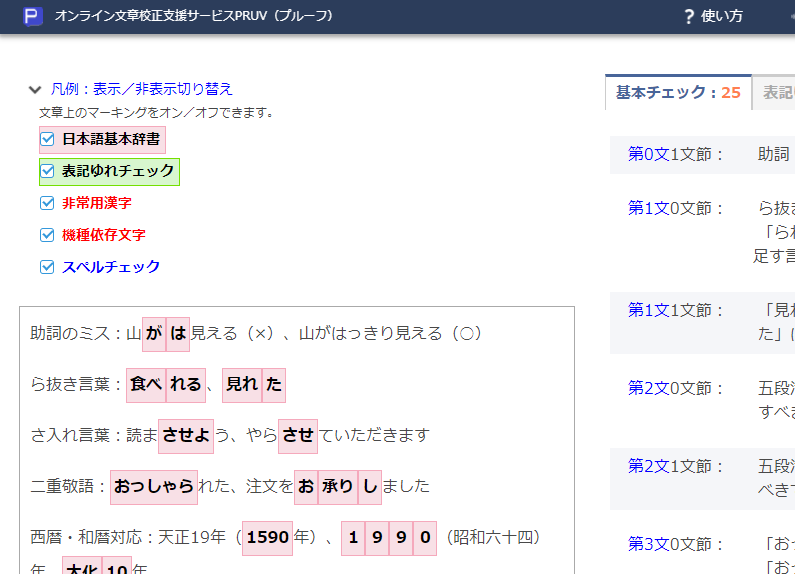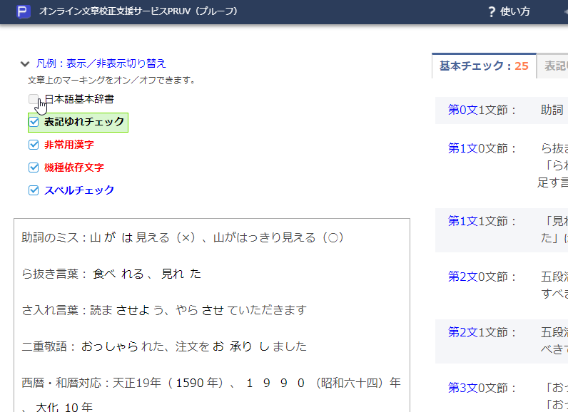 なお、マーキングのオン/オフ状態は保存しません。文章をチェックするたびに全てオンの状態になります。