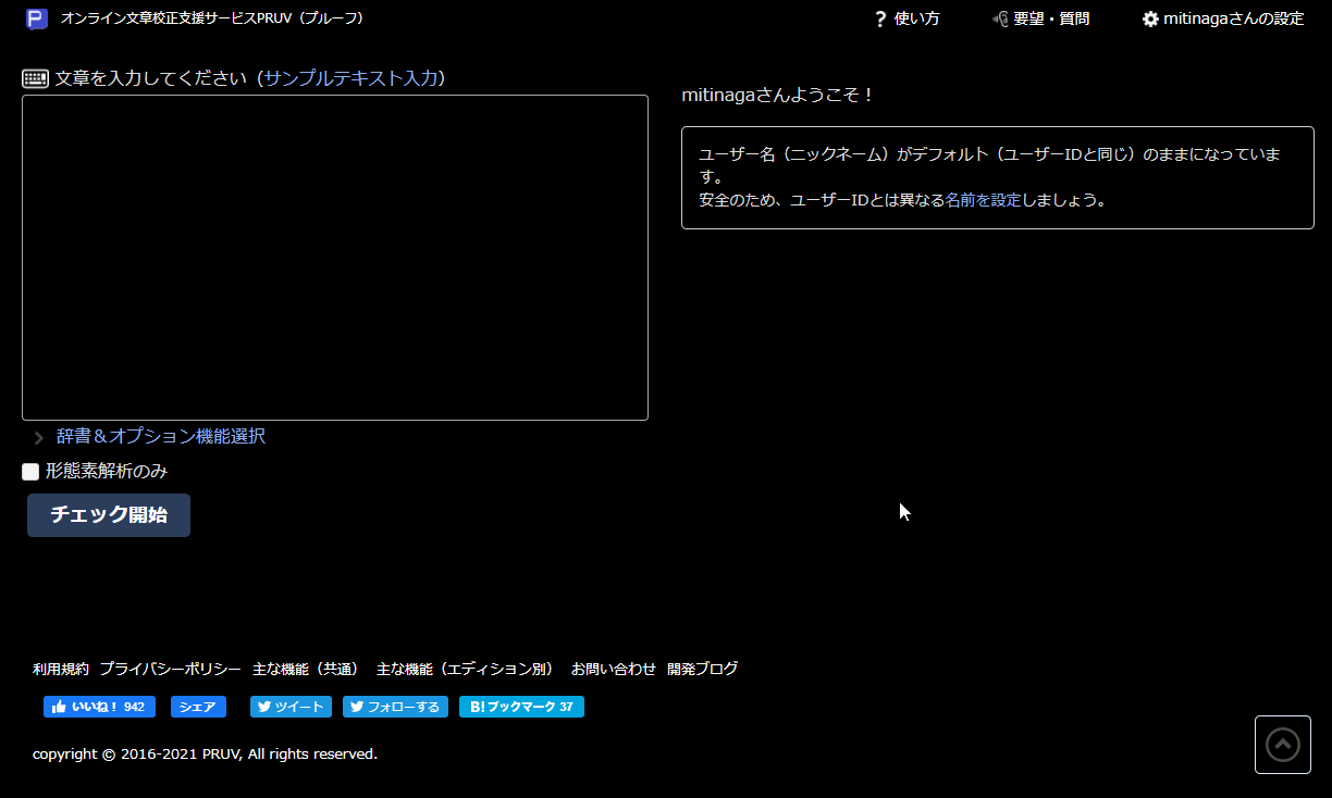カテゴリー:新機能 作成日:2021-03-04オンライン文章校正支援サービス「PRUV」が流行に乗って(正確には乗り遅れて)ダークモードに対応しました。黒字に白文字の画面表示モードです。