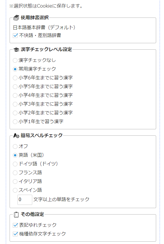 デフォルトは「常用漢字チェック」。多くの新聞や雑誌は、常用漢字を基準としつつ独自のルールを加えた表記ルールを定めており、オススメの設定です。