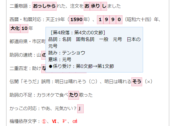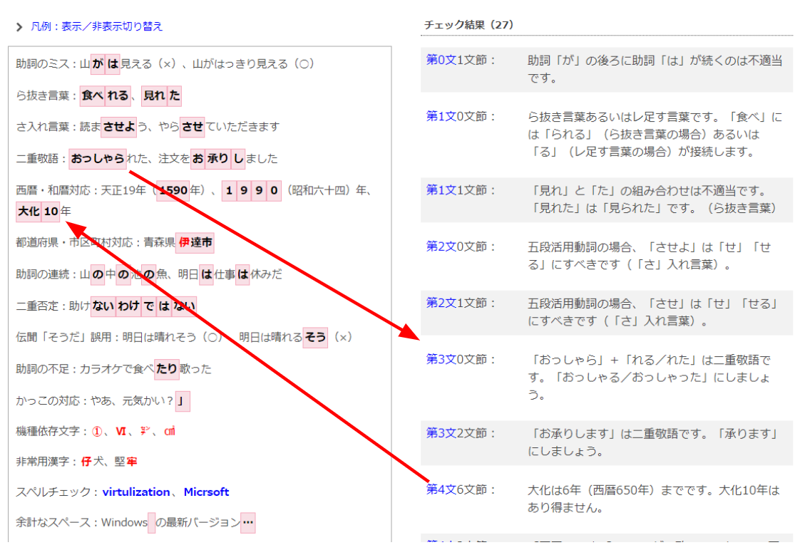 画面左側に注意してほしい箇所をマーキングした文章、画面右側に説明(チェック結果)が表示されます。左側の色が変わっている箇所をクリックすると、説明の該当箇所にジャンプします。また、説明の青文字(「第x文」)をクリックすると、文章の該当箇所にジャンプします。