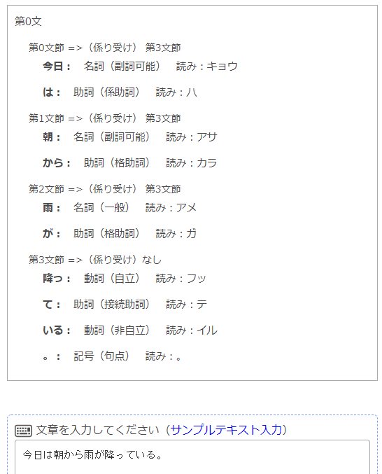 [チェック開始]ボタンの直上にある「形態素解析のみ」をオンにして[チェック開始]ボタンを押すと、文章チェックではなく形態素解析の結果を表示します。
