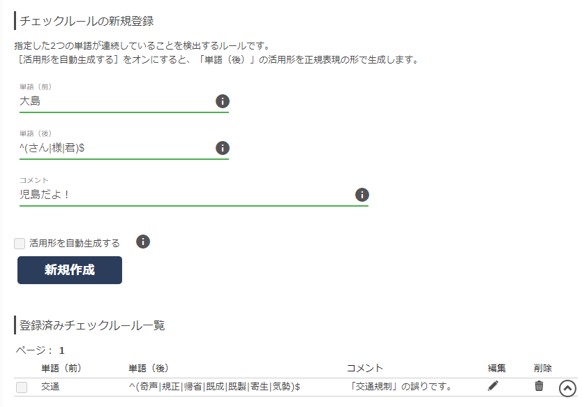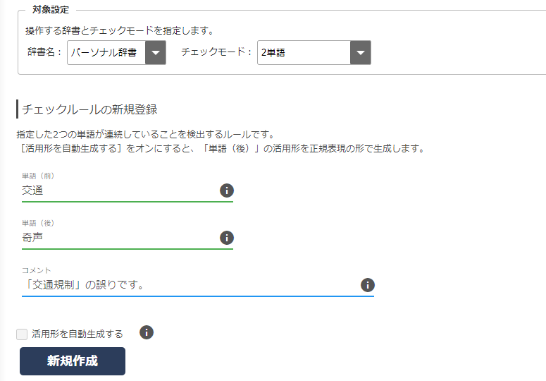 単語(後)が動詞あるいは形容詞の場合は、活用形を正規表現で自動生成できます。単語(後)に基本形「嫌う」を入力して、「活用形を自動生成する」をオンにして「新規作成」をクリックします。