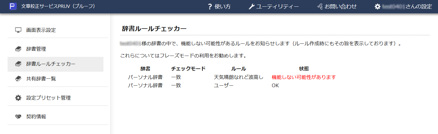 管理画面の「辞書ルールチェッカー」にアクセスするだけで、以下のようにユーザー辞書の全ルールを一覧表示し、機能しない可能性があるルールについてはその旨をお知らせします。