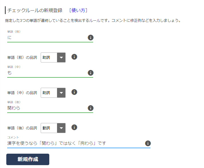 3単語ルールの場合、「単語(前)」は必ず「単語と認識される文字列」である必要があります。「単語(中)」と「単語(後)」は正規表現を使うことができますが、今回のケースでは「関わら」の活用形は不要なのでそのまま「関わら」を入力します。