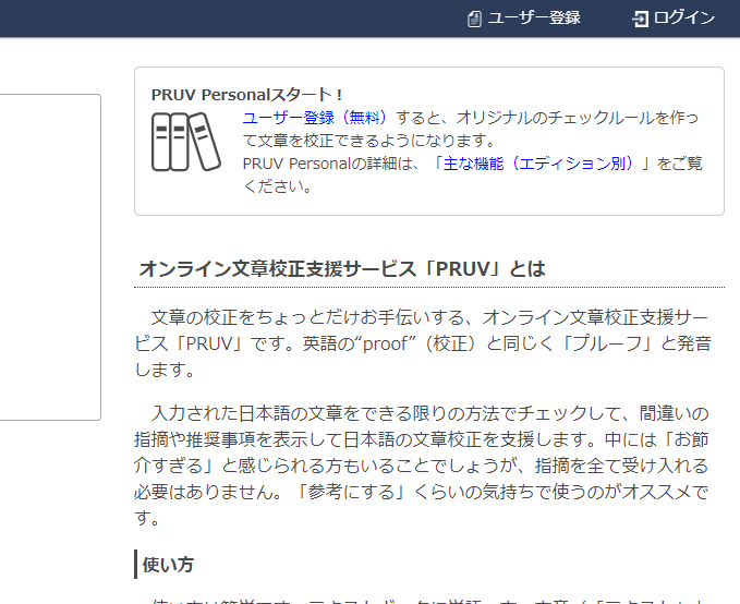 PRUVにログインするには、画面最上部の「ログイン」をクリックします。