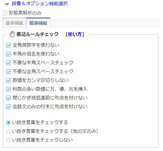 下記の機能を利用する場合は、「辞書&オプション機能選択」の「拡張機能」タブにある[表記ルールチェック」で必要なものをオンにしてください。