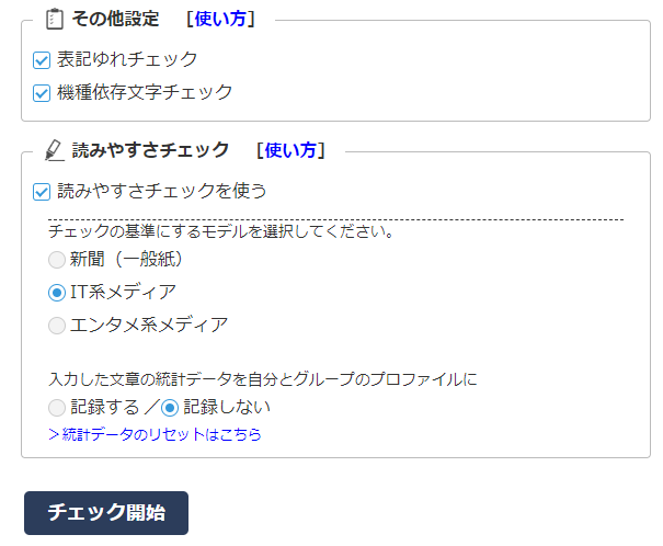 「読みやすさチェックを使う」をオンにすると、設定項目が表示されます。PRUV Pro/Businessユーザーは、チェックの基準にするモデルを「新聞(一般紙)」「IT系メディア」「エンタメ系メディア」から選択できます。