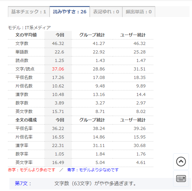 設定後に文章チェックを実行すると、統計情報を出力します。モデルと比較して、多過ぎる要素は赤字、少な過ぎる要素は青字で示されます。さらに、モデルの数値を大幅に上回る文を個別に指摘します。
