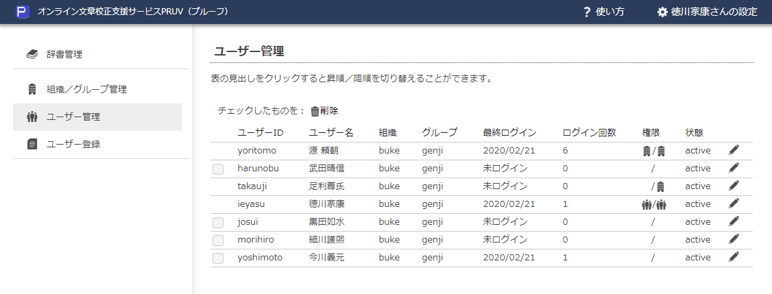 画面1がユーザーの一覧です。基本的には「ユーザーID」でソートされていますが、表の見出しをクリックすることで、その見出しで昇順/降順ソートできます。画面1は「グループ」でソートした状態です。